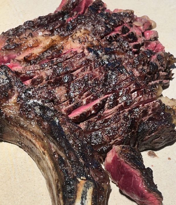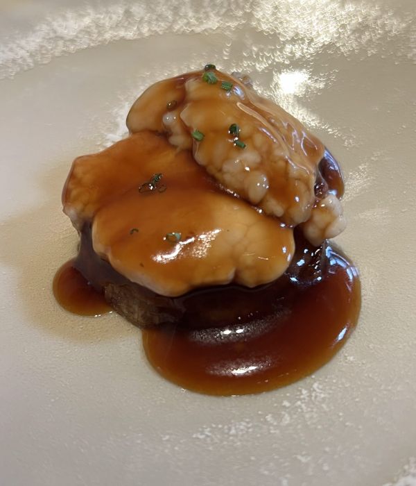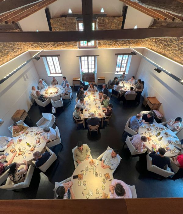 La jornada comenzó en la terraza, donde nos recibieron con una copa de champagne y un aperitivo que marcó el tono de lo que vendría después. Ya en el comedor, disfrutamos de un menú espectacular, dominado por las brasas y la calidad de su producto, con el especial protagonismo de sus famosas txuletas. Como acompañamiento, una selección de vinos a la altura, gracias a la selección del siempre infalible Moha Benabdallah, con un vino dulce final sencillamente maravilloso.