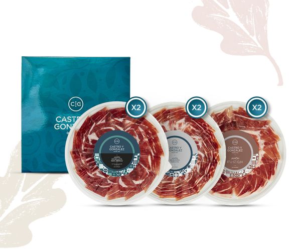Pack “Degustación” 6 blíster MAP. Descubre la excelencia ibérica con nuestro exclusivo Pack Degustación Gourmet: 2 platos de Jamón de Bellota 100% Ibérico (100 g) + 2 platos de Jamón CYG FUSION (100 g) + 2 platos de Jamón SELECCION 100% CYG (100 g).