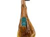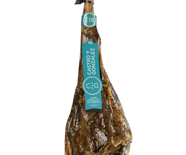 Jamón de bellota 100% ibérico. Peso: 10 kg. Jamón de Bellota 100% Ibérico que se reconoce por su forma alargada con pezuña oscura y gastada, típica de los ejemplares ejercitados en el campo. Posee un color intenso y brillante con gran presencia de vetas blancas en su textura. En su degustación se aprecia un aroma intenso y persistente y se perciben pinceladas de frutos secos y campo, obteniendo un jugoso equilibrio entre el grado de salinidad y la cuidada curación, unido a un regusto largo y placentero que concreta aún más la experiencia que esta obra maestra de la naturaleza brinda al paladar.