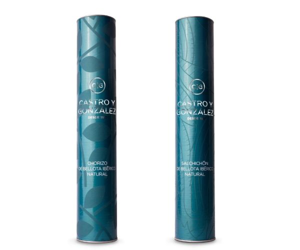 Chorizo & Salchichón de Bellota Ibérico «Natural» Premium. Peso 0,8 y 0,7 kg. Hecho con la más selecta carne magra de nuestros ejemplares ibéricos, nuestro Chorizo de Bellota Ibérico «Natural» en envase de lujo «Premium» obsequia a la vista con un color rojo intenso anaranjado de tacto suave y dureza media con aroma intenso en el que destaca con suavidad el pimentón empleado en su elaboración. De sabor intenso y penetrante otorgado por la presa ibérica que empleamos en su elaboración, nuestro Chorizo conquista los paladares más exigentes. Las piezas más nobles de nuestros ejemplares ibéricos, como la presa ibérica, son las que se utilizan para elaborar de forma artesanal nuestro Salchichón de Bellota Ibérico «Natural». Un aroma intenso, jugosa textura y especial equilibrio entre grasa, magro y pimienta negra, dotan de una sutil exquisitez natural a este producto, presentado en formato «Premium».