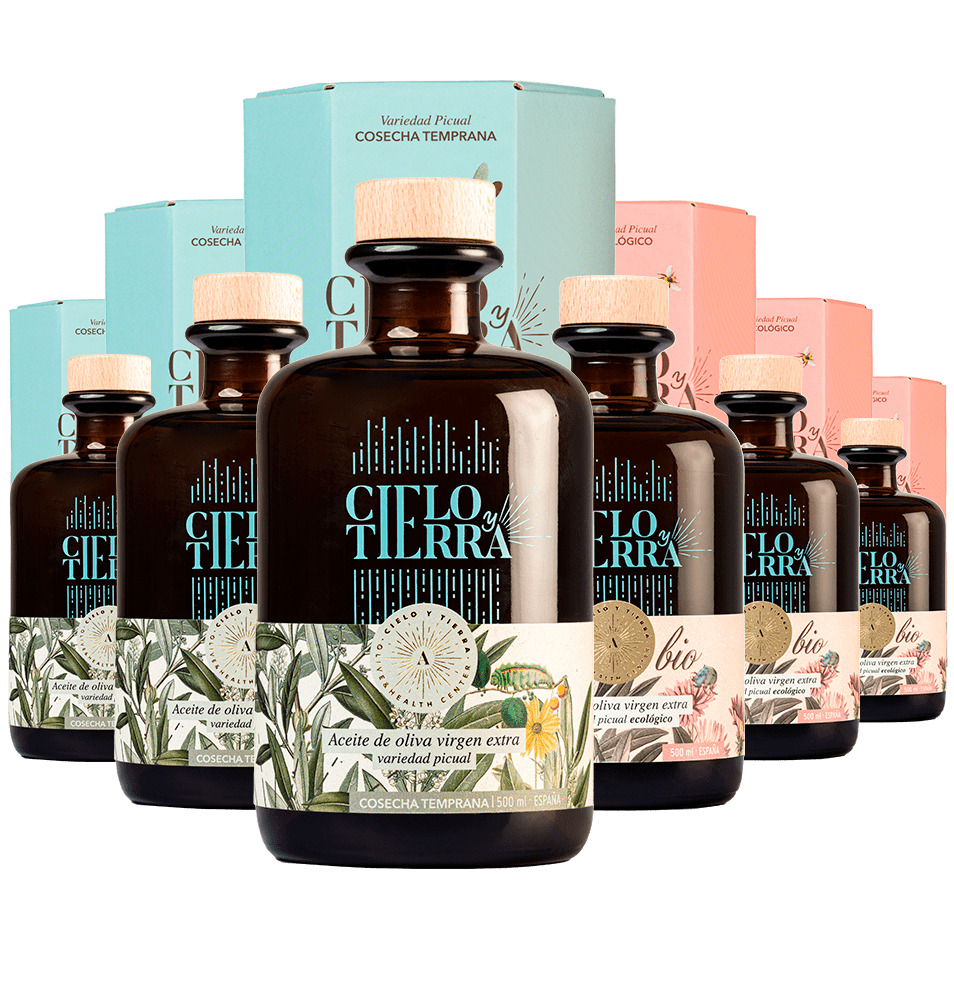 Dos maneras de entender el aceite de oliva virgen extra, un mismo origen: Jaén. Esta caja mixta reúne seis botellas de 500 ml -tres de Picual Cosecha Temprana y tres de Picual Ecológico- firmadas por Cielo y Tierra, una almazara que trabaja desde el respeto absoluto al fruto, al tiempo y al territorio. Un pack pensado disfrutar comparando matices: No, no todos los AOVE juegan en la misma liga.