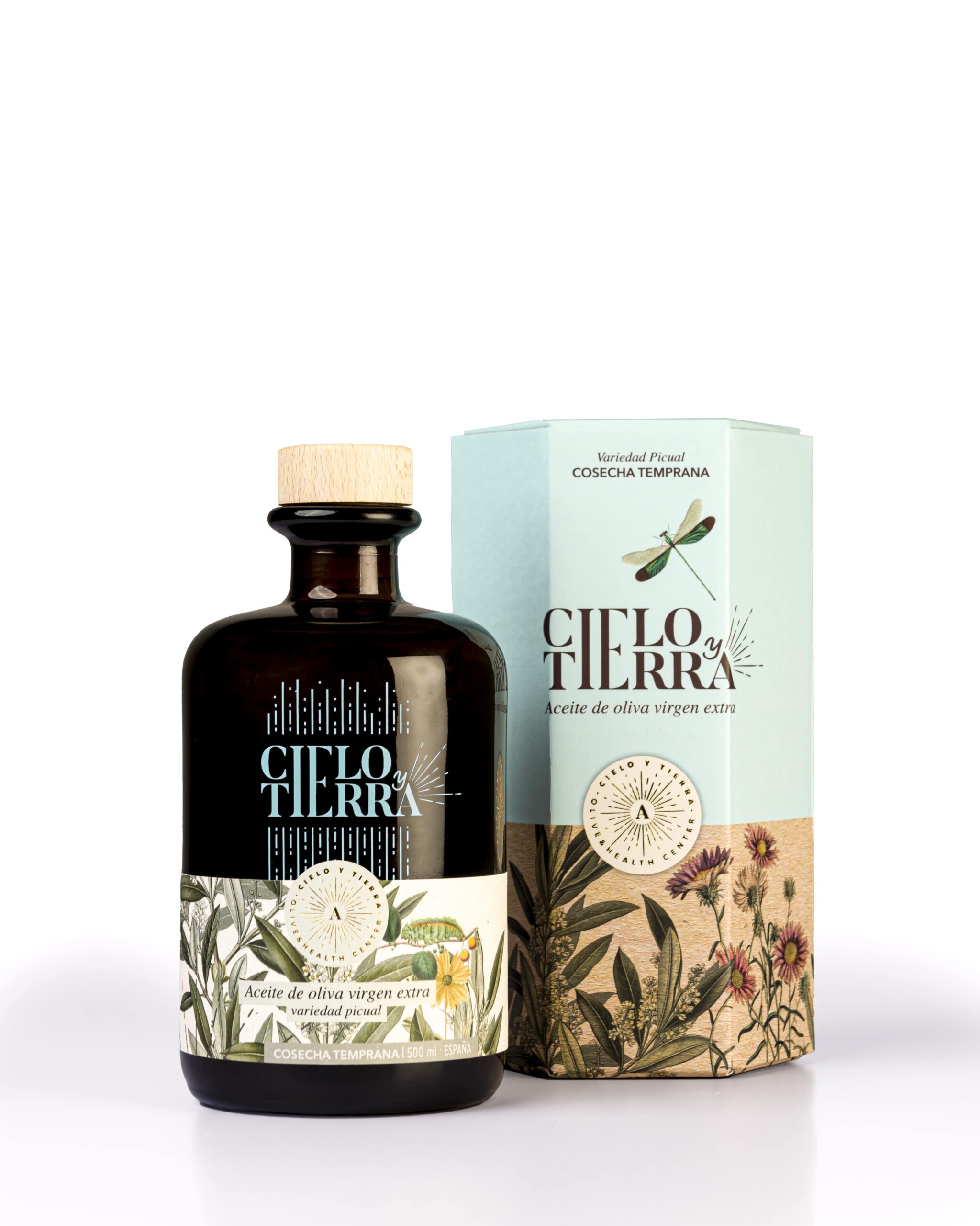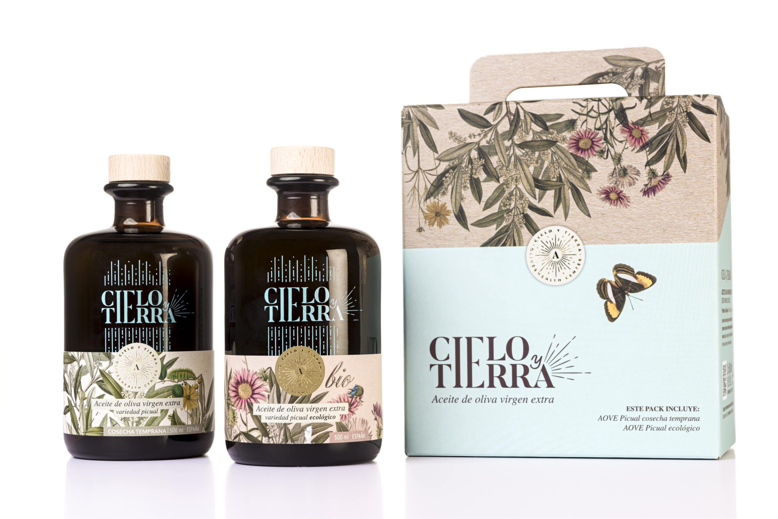 – Estuche pack doble (2 botellas): 1 Botella cristal 500 ml de AOVE Picual Cosecha temprana + 1 Botella cristal 500 ml de AOVE Picual Ecológico.