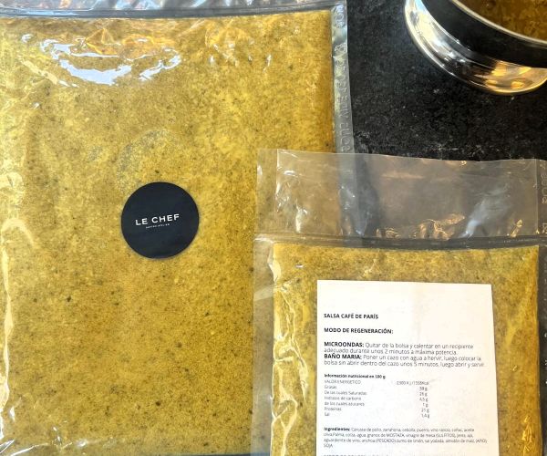 Una bolsa de 1 litro o ½ litro de salsa Café de Paris by Le Chef catering, lista para usar, con la comodidad de un formato práctico y la autenticidad de una receta legendaria.